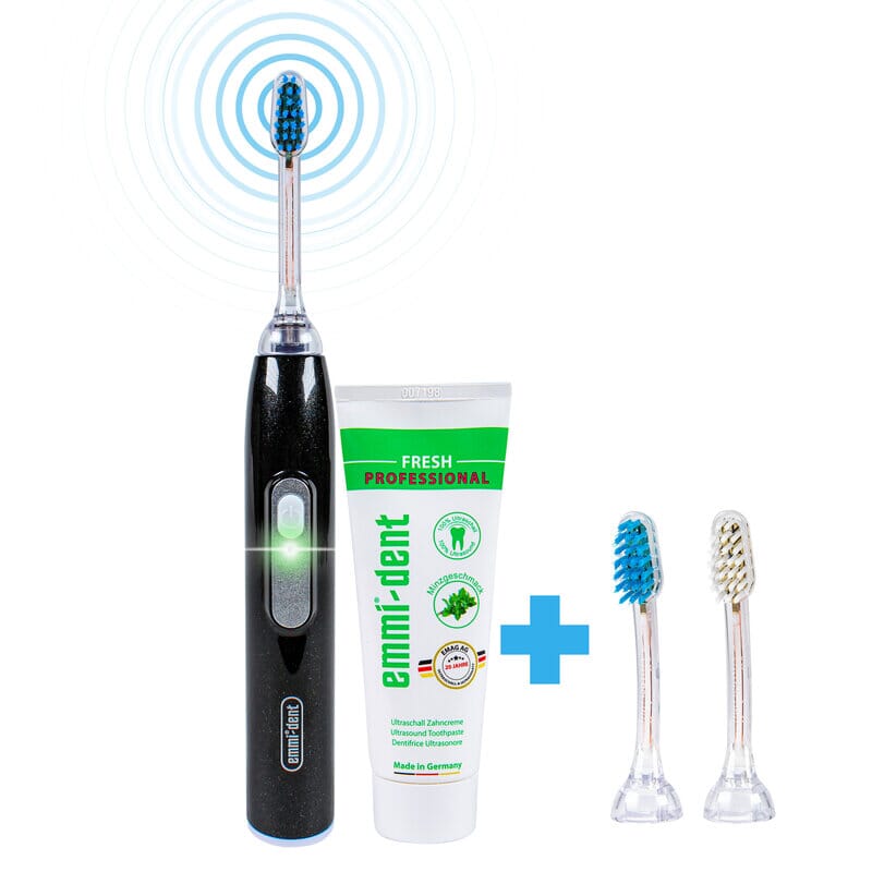 Die weltweit patentierte Piezo-Keramik-Scheibe (Ultraschallgeber) im Bürstenkopf generiert den Ultraschall und leitet diesen mit bis zu 96 Mio. Luftschwingungen pro Minute direkt in die mit Mikrobläschen angereicherten emmi®-dent Ultraschall-Zahncremes. Die Ultraschallwellen zerstören die Struktur der Mikrobläschen, daraus entsteht ein Sog-Effekt und dieser entfernt den Biofilm und Beläge. Somit reinigen Sie gründlich Ihre Zähne und schonen das Zahnfleisch, ohne zu bürsten. Fühlbar glatte Zähne sind das Ergebnis. Bakterien werden reduziert und der Mundraum bleibt nach der Reinigung länger anhaltend frisch.